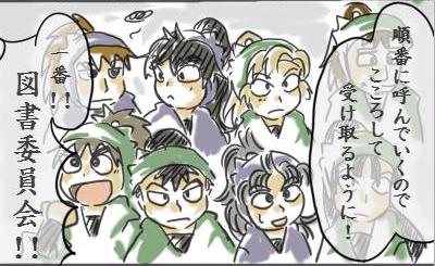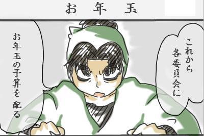 はい、確か結構勉強したはず。なのに。おいなのにっ! なんだあの問題形式は・・・・っっ!!聞いてないっ聞いてないっ!! 出すならそこじゃないだろっ!BDRの中身だろ!?必至こいて内容を頭につめこんだのに、答えるのBDRの名称だけってそりゃないわっ! 他にもうっかり見てなかった箇所が出まくってたり、あまり必要性を感じなくて流したところが記述で出てきたりと、散々でございましたが、 まぁテストってこんなもんさ。落ちた時は落ちた時(爆 そういえば昨日のおひるまはずっとテレビで今まで見れてなかったニュース見てました。なんか・・・不況がすごいですねぇ。派遣村ってなんのこっちゃって思ってたけどそういうことか。他にも内戦のこととか。あ、それはZEROで桜井君が説明してたの聞いて理解したんですけど。 んで今日は天皇陛下即位20周年らしいですねっ!おぉぉおおぉ。ちなみに私はこの昭和天皇と平成天皇の中間あたりの世代なので、実は同い年が63年生まれと64年生まれと、元年がおります。面白い学年。意外といるんですよ64年生まれ。 そして昨日のニュースでへい!せい!じゃんぷ!(全部ひらがな)のコンサートも報道してました。最近になってようやっとジャニーズ達の顔の違いを理解してきました私は、ヘイセイジャンプ、非常に好きです。かわいい!みんなかわいい!(笑 そのコンサート映像の中で 忍たまOPの「勇気100パーセント」歌ってました。おーこの子たちも歌うんだねっ。もしかしてジャニーズのどれが歌ってもOKな歌なのか?(笑 そしてもう一つ言いたいことがっ! なんか一昨日ぼんやり見てた島田しん○けさんの番組で出た、「新撰組プロジェクト」なるものを聞いて盛大に噴き出してしまいました。やばいねその企画!面白い!さすがしんす○さん!実行してください!あぁ京都行きたい! 以下メルフォお返事ですww 2009.01.05 Mon 19:55:06 お年玉その後続きから見れます。図書委員と作法委員の場合。