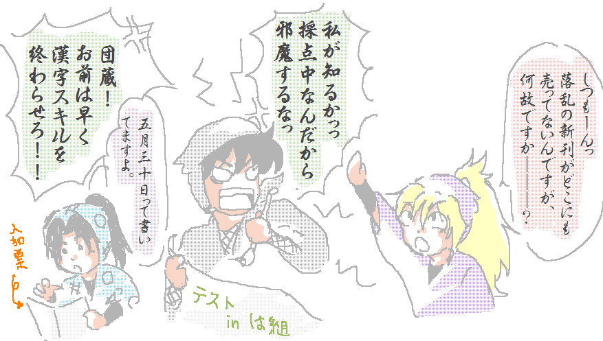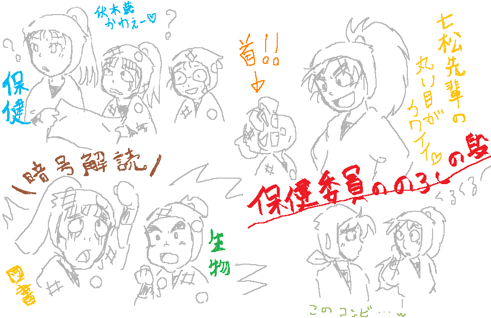 そういえば昨日の描いてませんでしたが、昨日のは昨日ので面白かったですね!乱太郎の腹黒さとかね(笑 今日のはなんか豪華でしたね!すっごい爆笑してました(笑 三郎次が岩の上に座ってる!!かわいい!!さりげなーく写る金吾とかw 一番のツッコミどころは仙蔵先輩ですね、ちょっとあれはやりすぎなんじゃっ。 死ぬ死ぬ死ぬ!!とかいいながら笑ってましたが、私が。 七松先輩やっぱり可愛いですねーーーwwwかわいいかわいいかわいいーwww 「どんどーん!どんどーん!」って!ほんっとかわいい!! きり丸に「おだちんあっぷ」宣言している学園長ですが、本当にちゃんとおだちんアップしてくれるんでしょうかね・・・。 乱太郎助けた土井先生がえっらい忍者&先生っぽくてかっこよかったです。それにしても土井先生もかわいいなー! 対決のとき、さりげなーく くのいちに混じった久々知先輩を見つけて、彼への愛情の強さがうかがえました。 か、片目・・・っ(笑 それにしても、あいしゃの術ってあんなんでしたっけ。 いや、元天才忍者の大川氏がおっしゃることだ、きっとそうなんだろう・・・・。 PR 2008.05.11 Sun 21:51:55 あれー?2008.05.10 Sat 19:13:19 保健委員会ののろしの段このシリーズはずっと出まくってたんですが、 伏 木 蔵 か わ え え え ー ー ! ! 本当に可愛い。ものすごく可愛い。なのに私がかわいいって言っても友達は同意してくれません。 あの前髪が許せないんだそうです。なんで、かわいいのにっ あやかし丸初めてかきましたが、この子はシャドー先生のオーラを直に受けてますよね、ちょっとヒドイんじゃないの! とら若のふっくらしたほっぺが大好きです。 七松先輩の丸い目も大好きです。っていうか前にも何回も言いましたが、6年生では七松先輩が一番好きなんです。それを友達に言って見せたら、今度は眉毛に文句つけられました。ゲジマユが許せないんだとか。 なにをーーー!かわいいじゃねえかーー!! ちなみに久々知先輩も文句言われました。目が四角いとかメガネかけてるみたいだとかゲジマユとか。 確かに目は四角いけど可愛いじゃないのー!!どうしてわかってくれないんだろう。 最後のあの変装の名人君は回りすぎじゃないですか。 2008.05.10 Sat 18:24:00 あれー2008.05.10 Sat 10:32:41 ふっかーつパソコンつかえない日は仕方なく感想ストップしてましたが、忍たまはちゃーんと見てました。